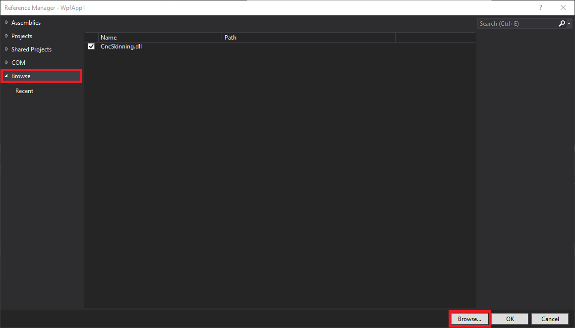 Select "Browse" category, then click "Browse..." and navigate to the location of the "CentroidAPI.dll". It is located in the root directory of your CNC12 installation (cncm, cnct, MillDemo, or LatheDemo folder). Select it, then press OK.