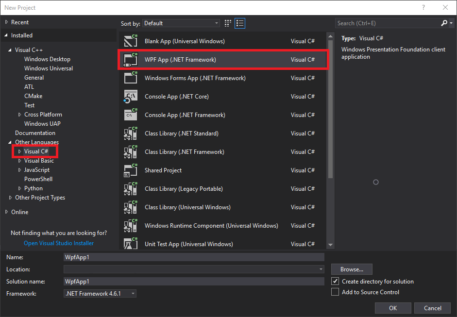 Select "Visual C#" as your language, and choose "WPF App (.NET Framework)" as your project type.